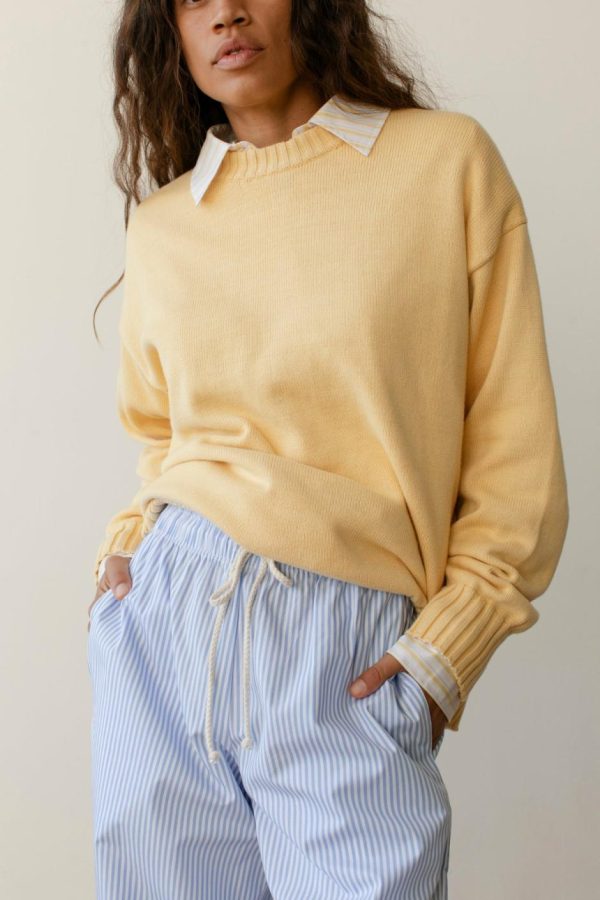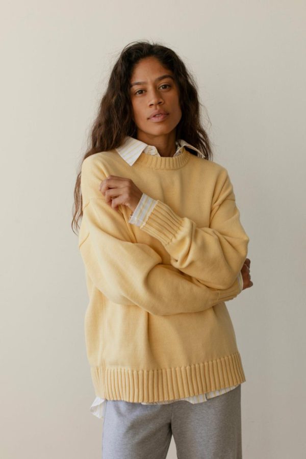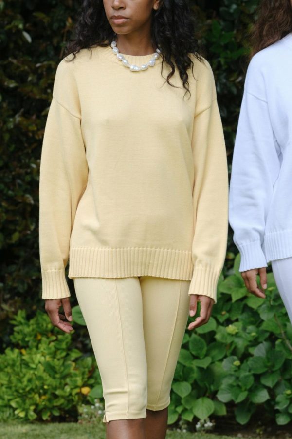 The Cotton Knit Crewneck is crafted with 100% Organic Cotton, featuring a slightly oversized fit and ribbed edges.