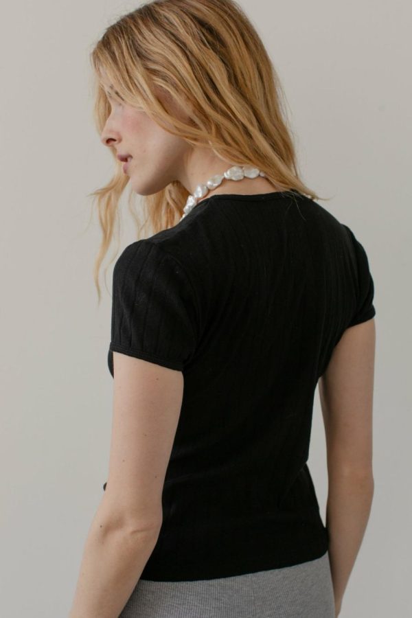 The Pointelle Baby Tee is crafted with 100% Organic Cotton, featuring a slim-fit, crewneck, and cap sleeves.