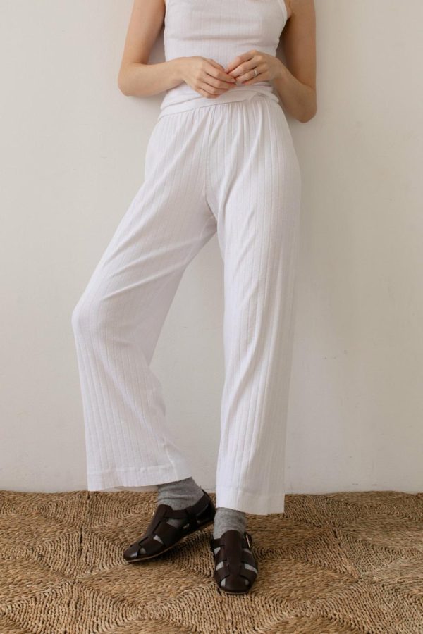 The Pointelle Simple Crop Pant is crafted with 100% Organic Cotton, featuring a cropped fit, wide leg and elastic waist.