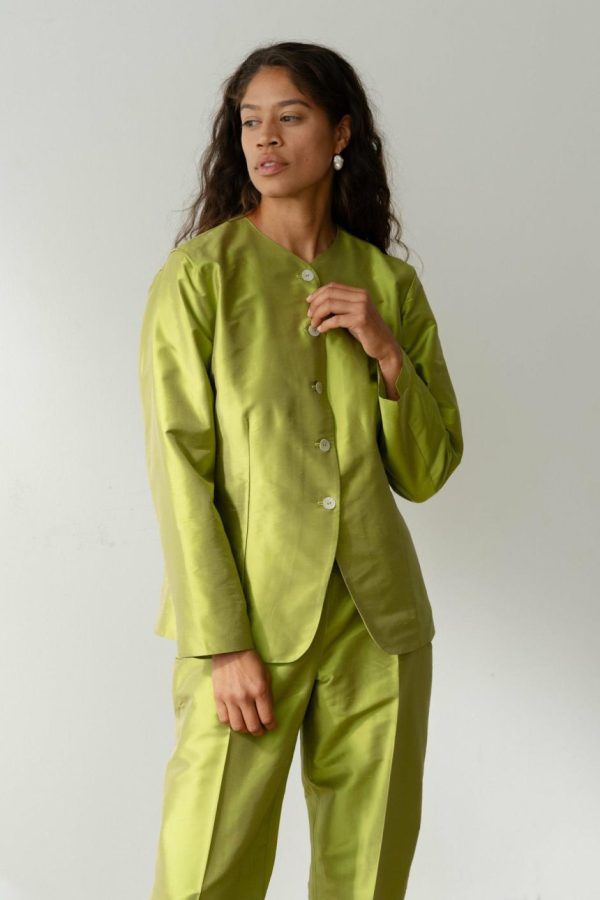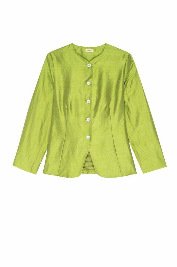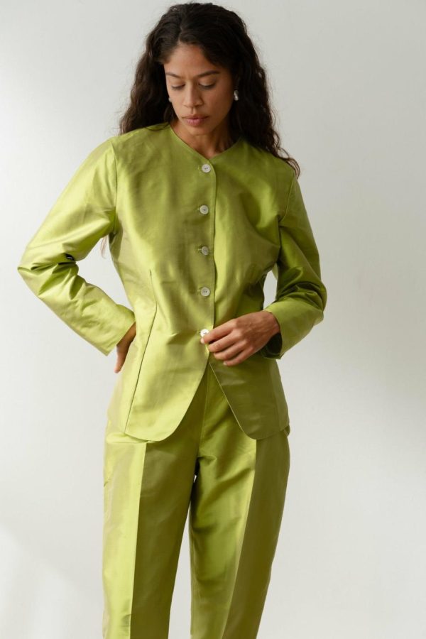 The Silk Taffeta Jacket is crafted from 100% silk with a sleek, tailored fit. Featuring a rounded neckline, subtle seams, and button closures, it’s a versatile piece that elevates any look.